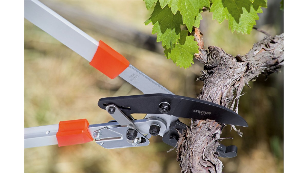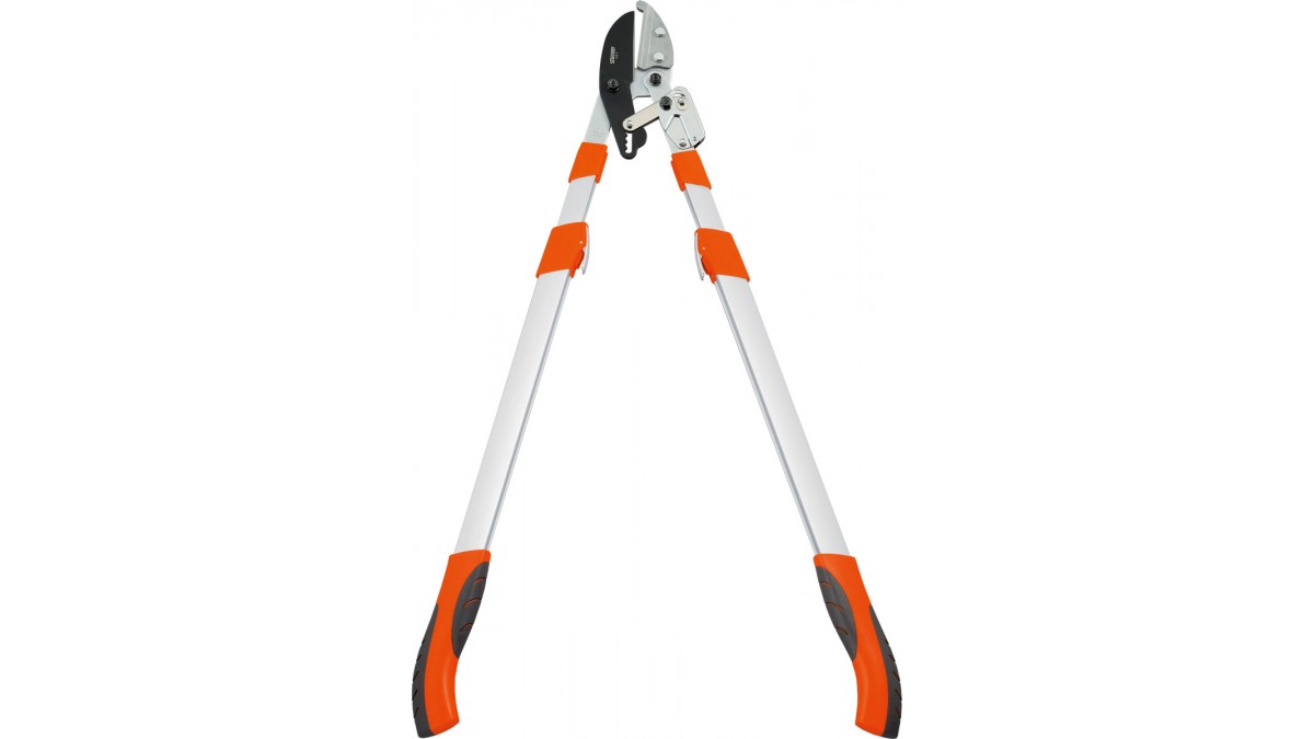 Cleste profesional pentru taiat, cu maner telescopic, de tip nicovala, cu o transmisie a puterii ce economiseste din energia necesara taierilor.