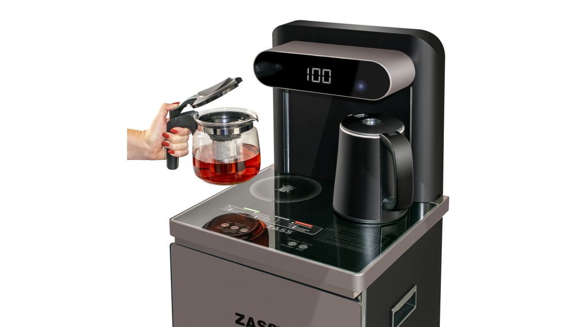 Oriunde este pozitionat, dozatorul ZASS va furniza apa rece sau la temperatura ambientala fiind gandit pentru a te ajuta in prepararea ceaiului in cana de ceai cu infuzor din dotare, apa fierbinte pentru ceai fiind anterior incalzita cu ajutorul fierbatorului de apa. Panoul de comanda cu ecran tactil este conceput pentru operare simpla si inteligenta, comenzile si executia lor fiind afisate digital in zona frontala superioara cu afisaj LCD.