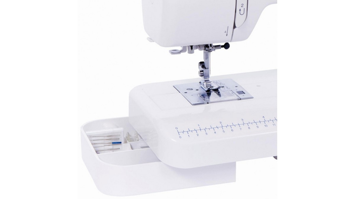 - masina este dotata cu un compartiment incapator pentru accesorii (picioruse, mosorele, ace, surubelnite, cutitas pentru fire etc).