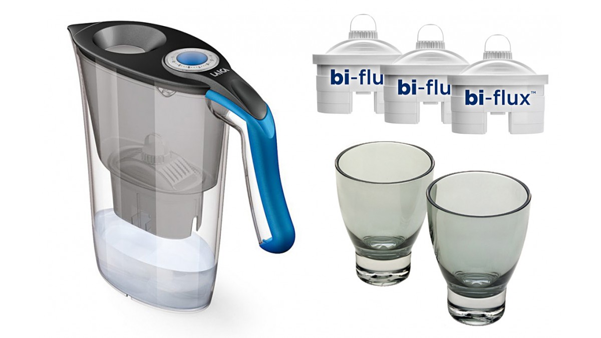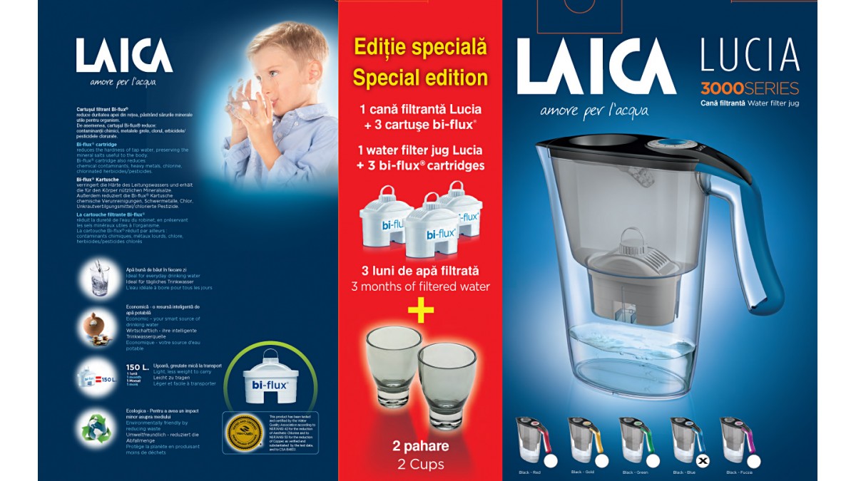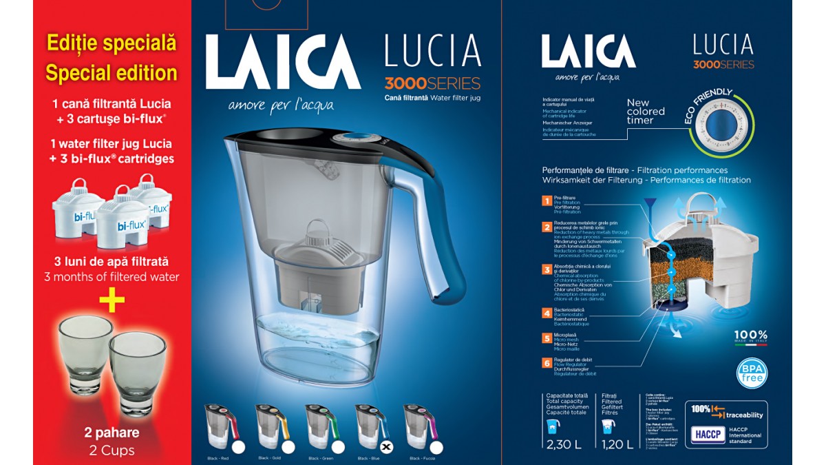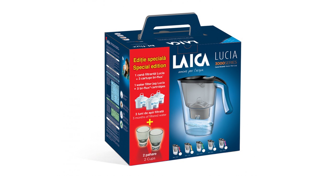 Pachetul contine: cana filtranta Laica Lucia blue fabricata in Italia, 3 cartuse filtrante Laica Bi-flux, 2 pahare de colectie colorate gri fumè, certificat de garantie timp de 2 ani, manual de utilizare in limba romana.
