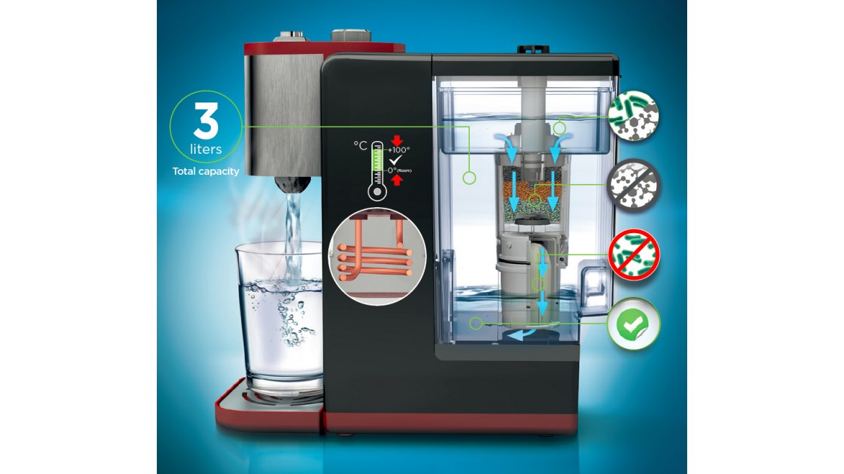 Încălzitorul de apă Laica Volcano oprește 99,999% din germenii care se pot afla în apa de băut.